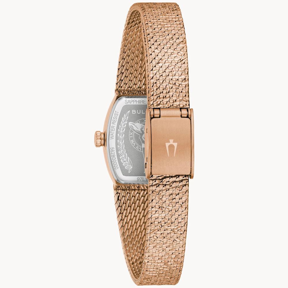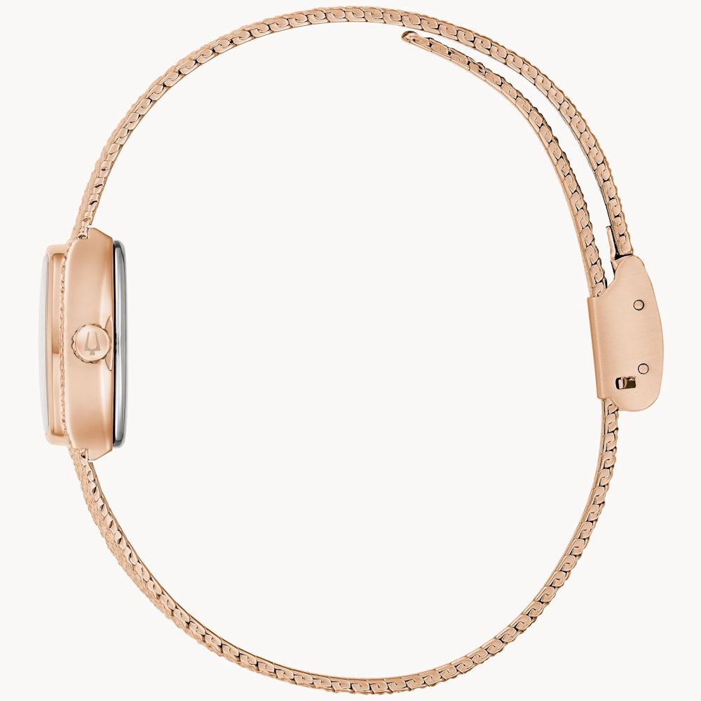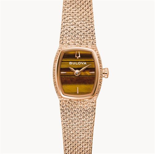 Bulova Goddess of Time watch. Model 97L185. Quartz movement. Stainless steel rose gold plated case with mesh bracelet. Brown Tiger Eye stone dial.