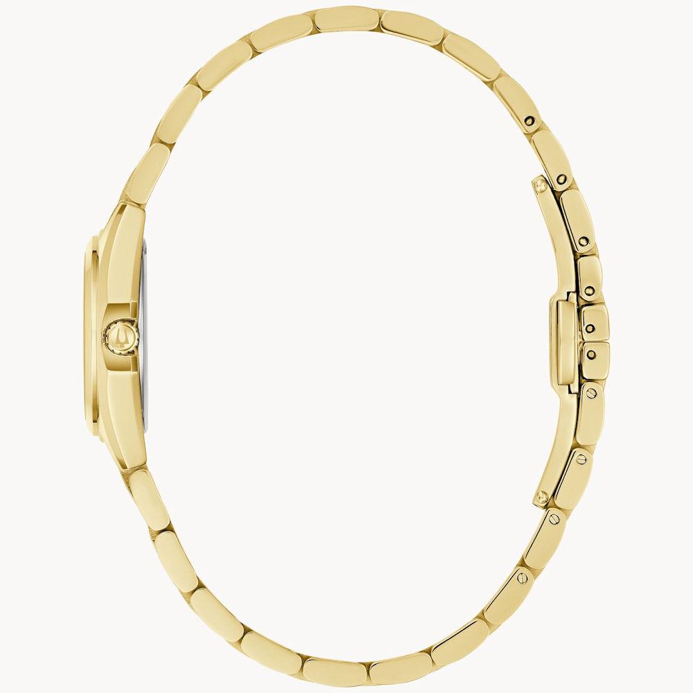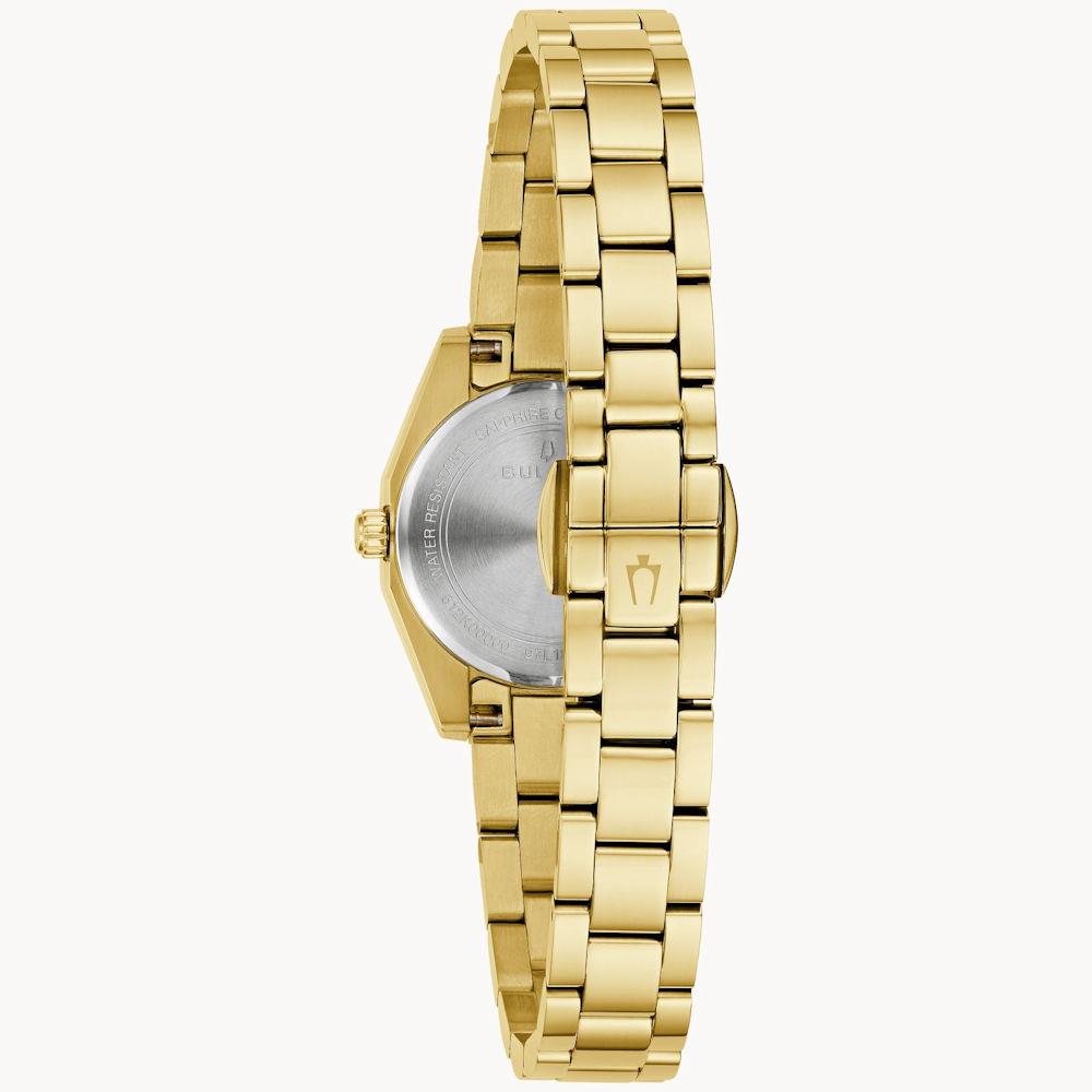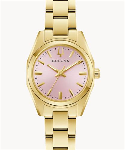 Bulova Surveyor Collection. Model 97L187. Quartz movement. Stainless steel yellow gold plated case and bracelet. Pink dial.
