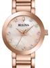 Bulova Classic watch. Model 97P132. Quartz movement. Stainless steel rose gold plated 30mm case with bracelet. Rose Mother-of-Pearl dial with diamond markers.