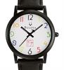 Bulova Frank Lloyd Wright Men`s Exhibition Watch. Model 98A103. Wright created Exhibition typeface for use on his exhibition drawings in the 1930s. Dial has been reproduced from the original typeface with multi-colored numerals, ruler-lined hand and t-square second hand. Quartz movement. Black stainless steel case with black leather strap.