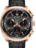 Bulova Men`s Curv chronograph watch. Model 98A156. High Performance Quartz Curv Chronograph movement. Rose gold plated stainless steel case with black leather strap. Curved sapphire crystal. Black dial with rose gold tone hands, markers, and red color accents.