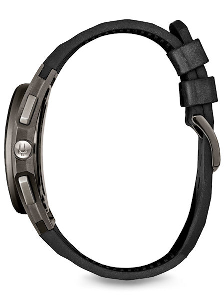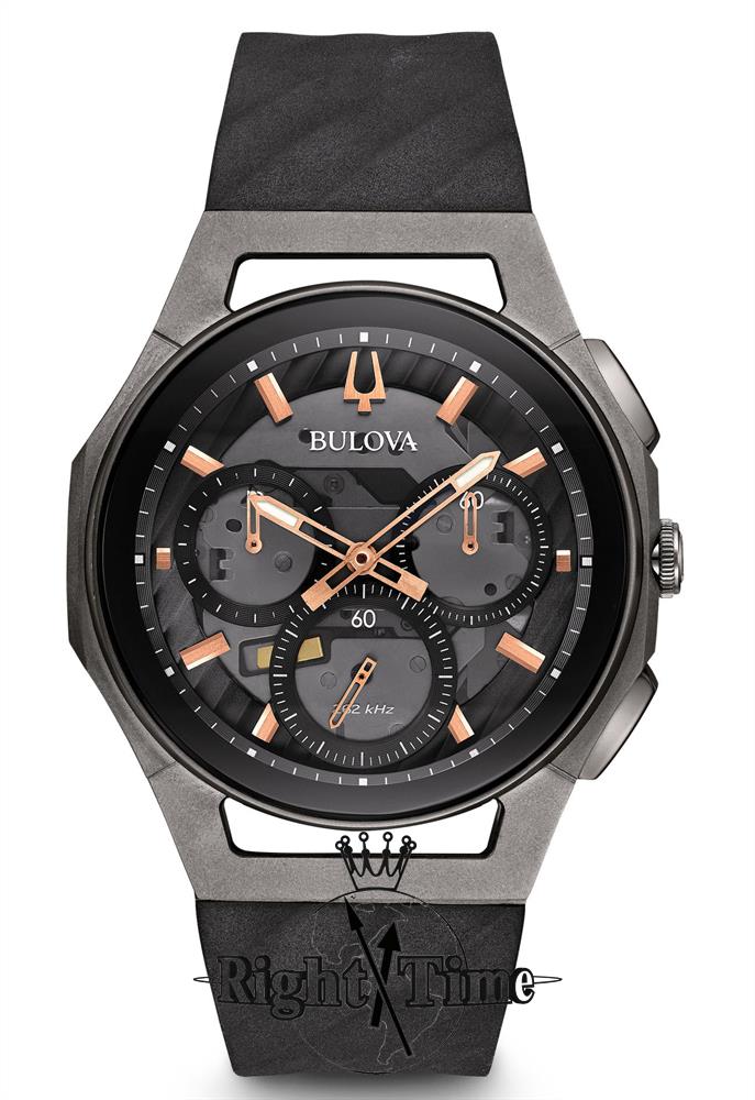 Bulova Men`s Curv chronograph watch. Model 98A162. High Performance Quartz Curv Chronograph movement. Stainless steel and titanium case with black rubber band and see-through back. Curved sapphire crystal. Grey exhibition dial with rose gold tone hands and markers