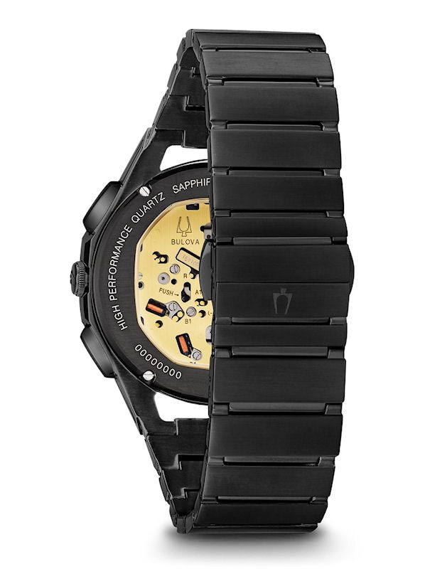 Bulova Men`s Curv chronograph watch. Model 98A207. High Performance Quartz Curv Chronograph movement. Black IP-plated stainless steel case and bracelet. Curved sapphire crystal. Black dial