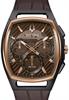 Bulova Curv chronograph watch. Model 98A264. High Performance Quartz Curv Chronograph movement. Stainless steel black plated tonneau case with rose gold plated bezel, brown leather band, and see-through back. Curved sapphire crystal. Brown dial with rose gold tone hands.