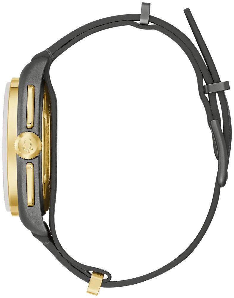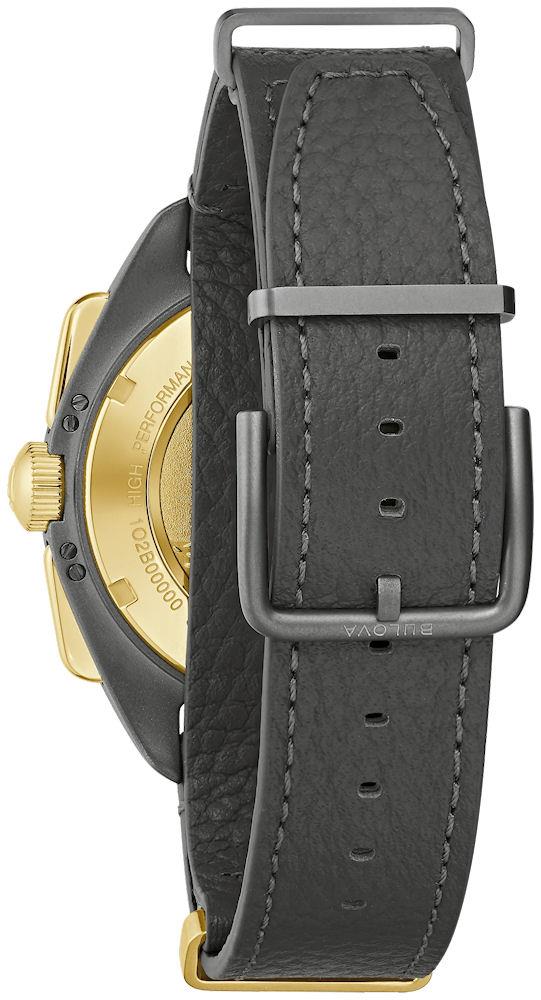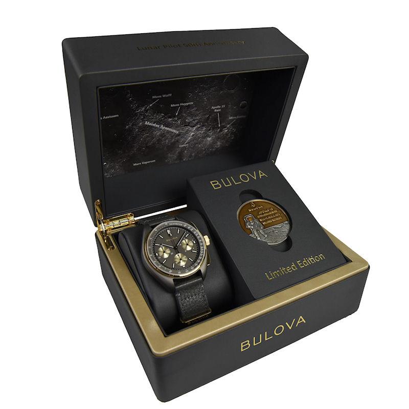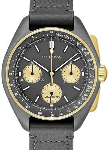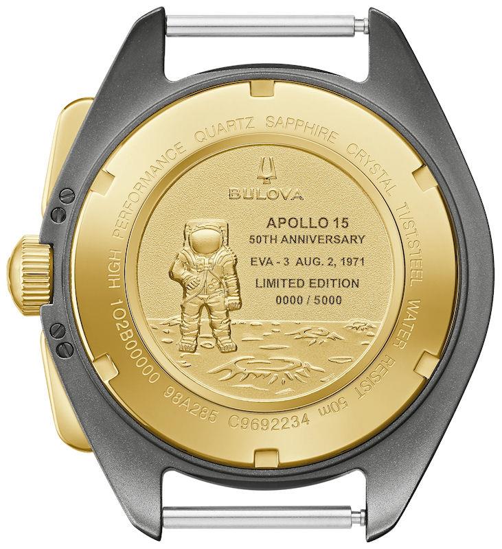 Lunar Pilot Chronograph from the Archive Series. In a celebration of the 50th anniversary of Apollo 15 and the lunar landing. Limited Edition. Watch model 98A285. Quartz chronograph movement. Titanium 2-tone case with grey leather band and decorated back. Grey color dial.