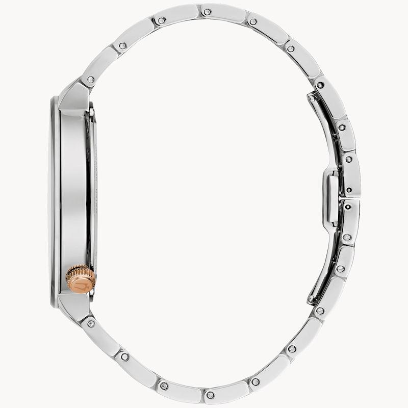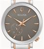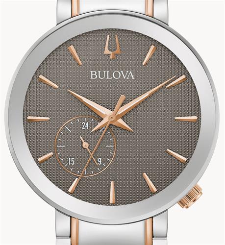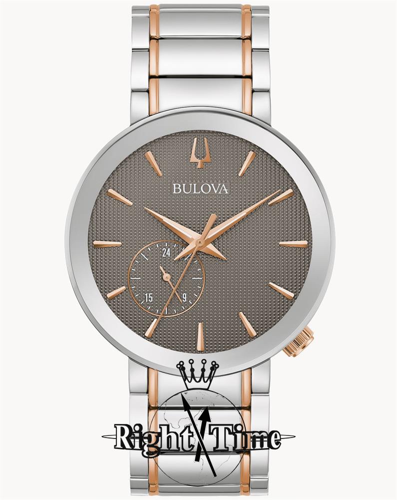 Bulova Latin Grammy`s Special Edition model 98A309. Japanese Miyota quartz analog movement with 24 hour hand. High polished stainless steel case and bracelet with rose gold accents. Textured dark gray dial with polished rose color hands and markers. Sapphire crystal.