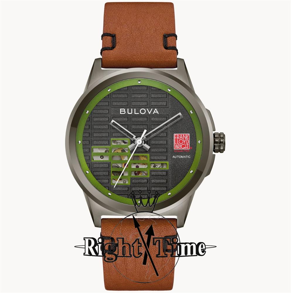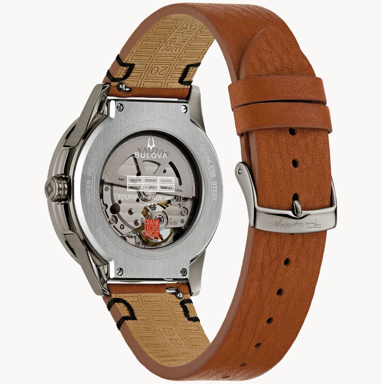 Bulova Frank Lloyd Wright Kalil House Automatic watch model 98A330. Tribute to the Toufic H. Kalil house, one of the prolific architect`s Usonian Automatic homes, built in 1955. Textured gray and green dial evokes the home and its forested surroundings while recreating its most eye-catching element, the modular block construction and multiple rows of rectangular windows. Automatic movement. Grey ion-plated stainless steel case with brown leather strap.