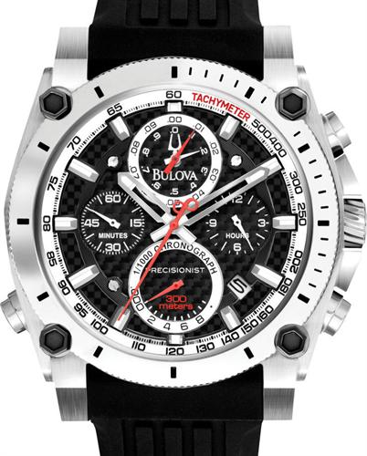 Bulova Precisionist Champlain Collection model 98B172 operated by quarts chronograph movement with continuously sweeping second hand. Stainless steel case with black rubber band. Black carbon fiber dial with red color accents, date calendar and luminous hands. Water resistant to 300 meters