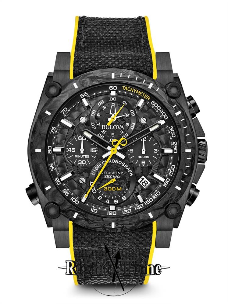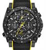 Bulova Precisionist Collection model 98B312 operated by quarts chronograph movement with continuously sweeping second hand. Black PVD plated 316L stainless steel case. Black nylon and yellow rubber strap. Black dial, date and luminous hands. 300 meters water resistant