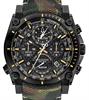 Bulova Precisionist Collection model 98B332 operated by quarts chronograph movement with continuously sweeping second hand. Black plated 316L stainless steel case. Camouflage leather band. Black carbon dial with orange color accents, date and luminous hands, tachymeter scale. 300 meters water resistant