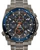 Bulova Precisionist Collection model 98B343 operated by quarts chronograph movement with continuously sweeping second hand. Grey plated 316L stainless steel case and bracelet. Blue IP plated bezel. Black carbon dial with orange color accents, date and luminous hands, tachymeter scale. 300 meters water resistant