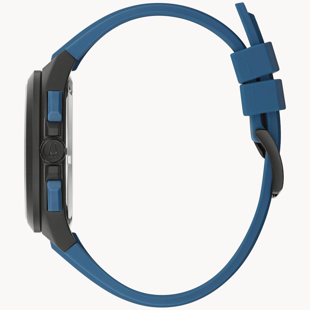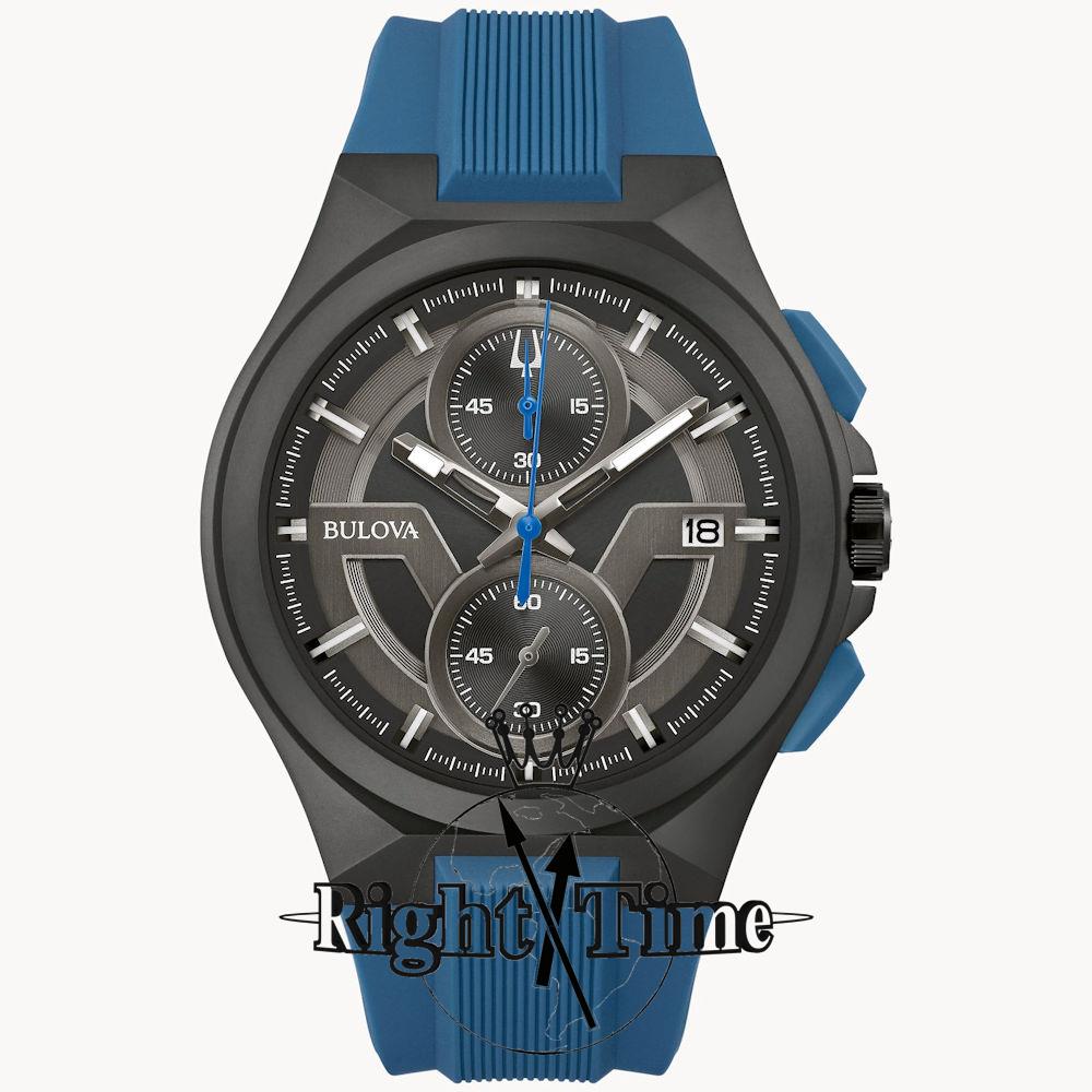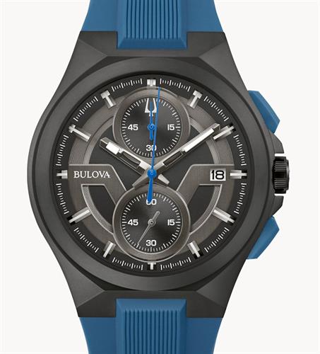 Bulova Maquina watch. Model 98B380. Quartz chronograph movement. Black IP plated stainless steel case. Black dial with date calendar. Blue rubber strap. 100 meters water resistant.