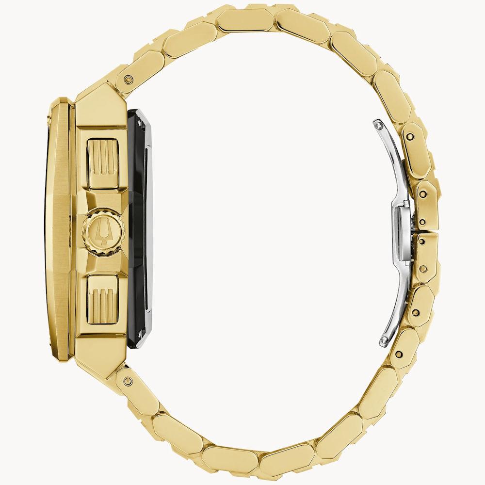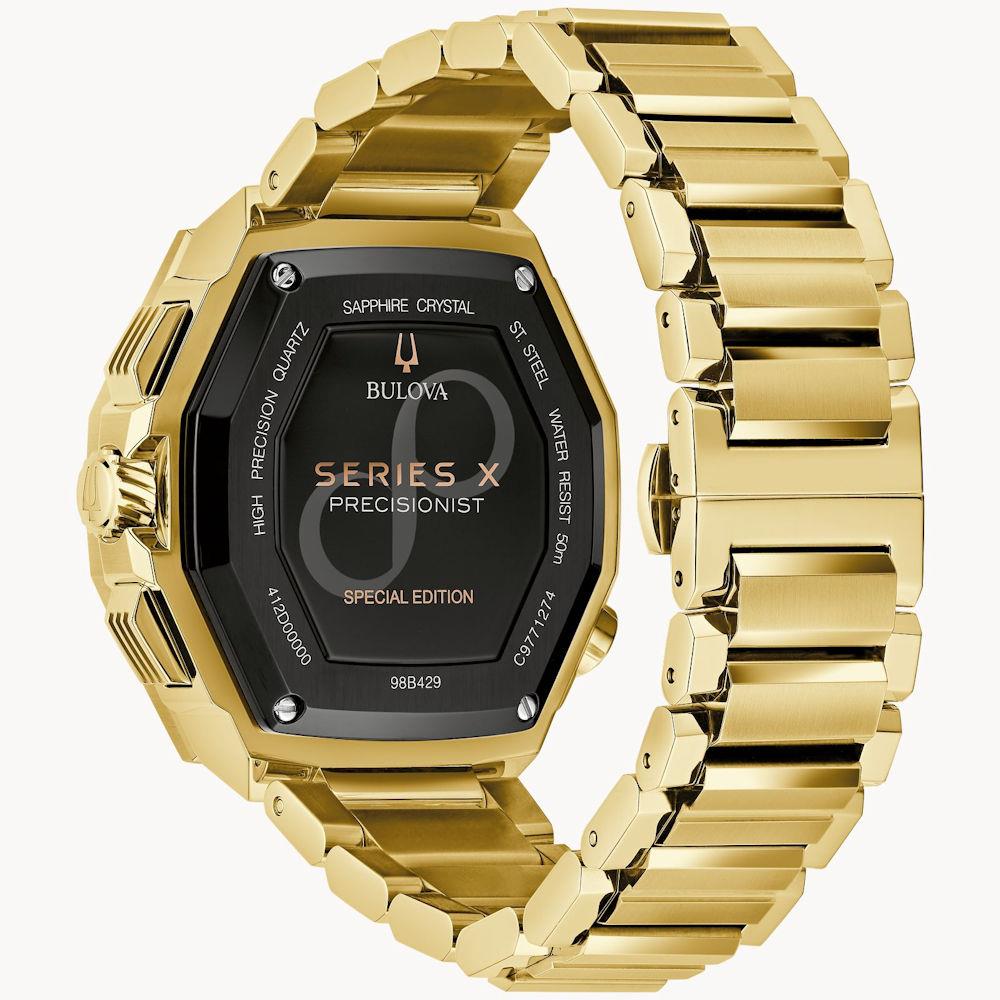 Bulova Precisionist Collection model 98B429 Series X SE. Watch operated by quartz chronograph movement with continuously sweeping second hand. Gold plated 316L stainless steel case with bracelet. Black dial with partially visible calendar ring, luminous hands, and markers. 50 meters water resistant