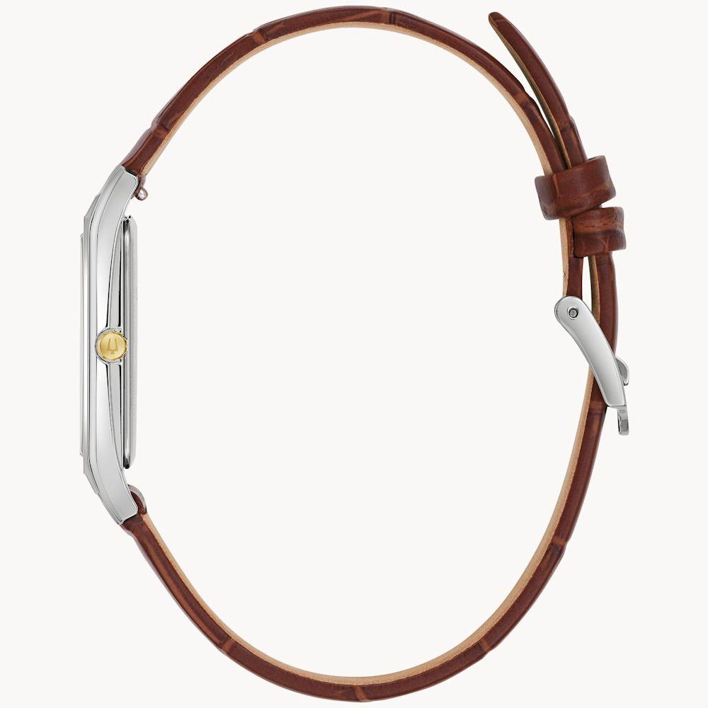 Bulova Sutton watch. Model 98B430. Quartz movement. Stainless steel case with gold plated bezel on brown leather strap. Silver dial with date calendar