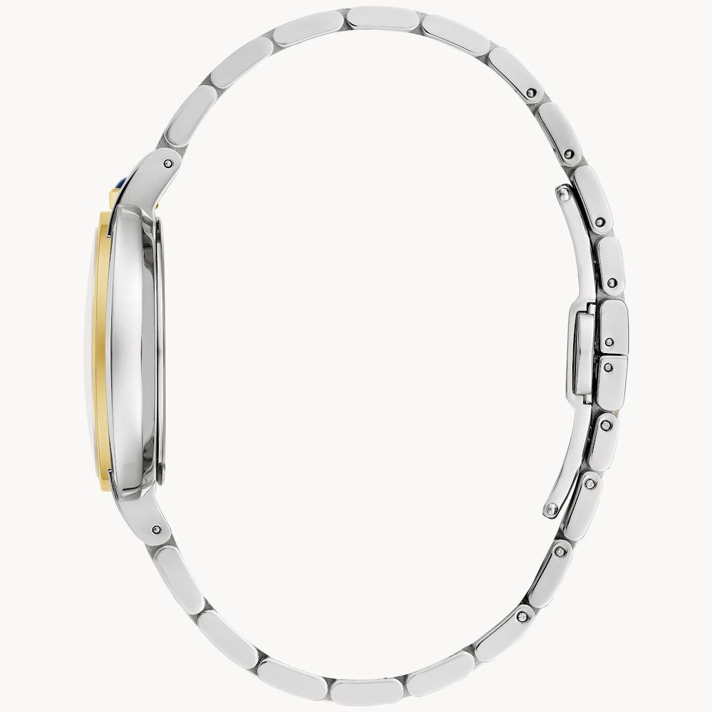 Bulova Rubaiyat watch. Model 98L320. Quartz movement. Stainless steel case and bracelet with gold tone accents. Silver tone dial