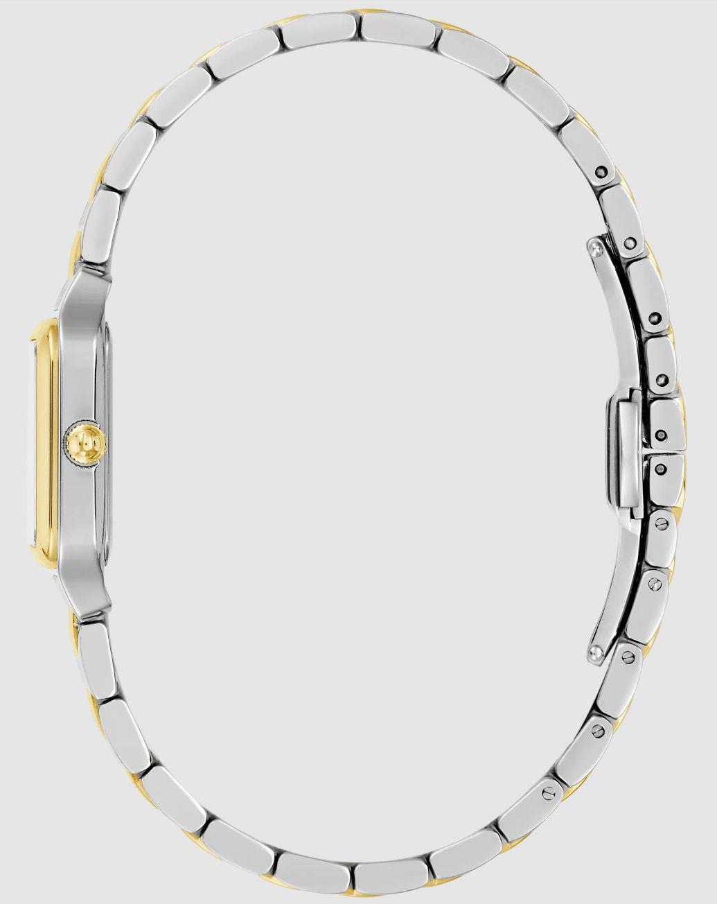 Bulova Sutton watch. Model 98L330. Quartz movement. Stainless steel case and bracelet with gold tone accents. Silver tone dial
