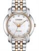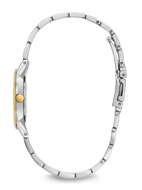 Bulova Classic watch. Model 98P115. Quartz movement. Stainless steel 27mm case with bracelet. Gold tone accents. White color with diamond and index markers.