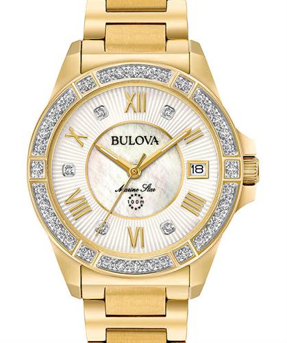 Bulova Marine Star watch. Model 98R235. Quartz movement. Stainless steel yellow gold plated case and bracelet with diamonds. White Mother-of-Pearl dial with diamond markers and Roman numerals.