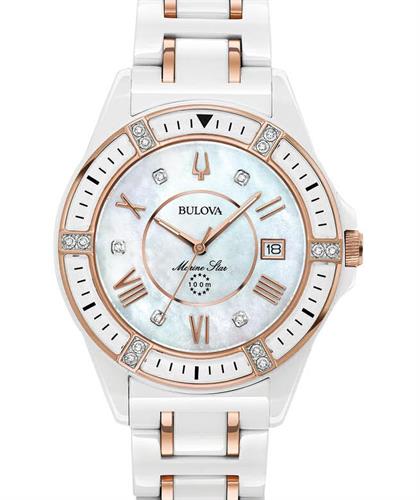 Bulova Marine Star watch. Model 98R241. Quartz movement. White ceramic case and bracelet with rose gold tone accents. White Mother-of-Pearl dial with diamond markers and Roman numerals.
