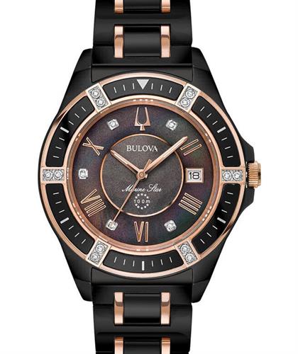 Bulova Marine Star watch. Model 98R242. Quartz movement. Black ceramic case and bracelet with rose gold tone accents. Black Mother-of-Pearl dial with diamond markers and Roman numerals.