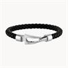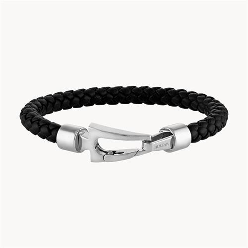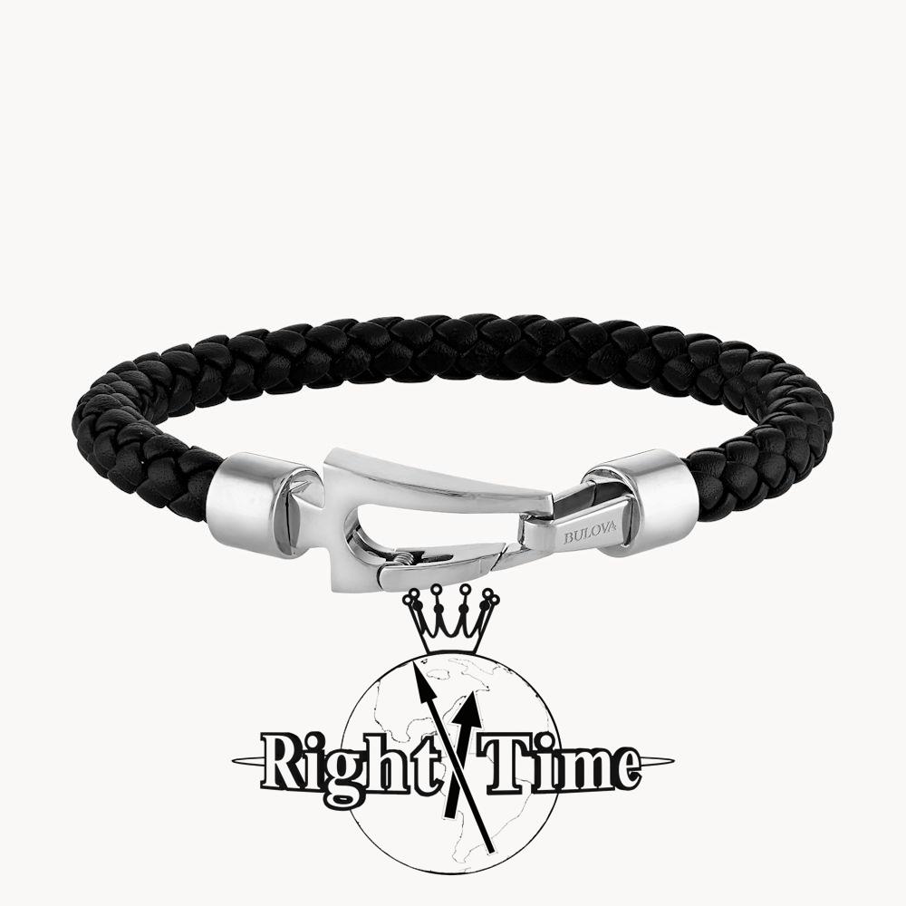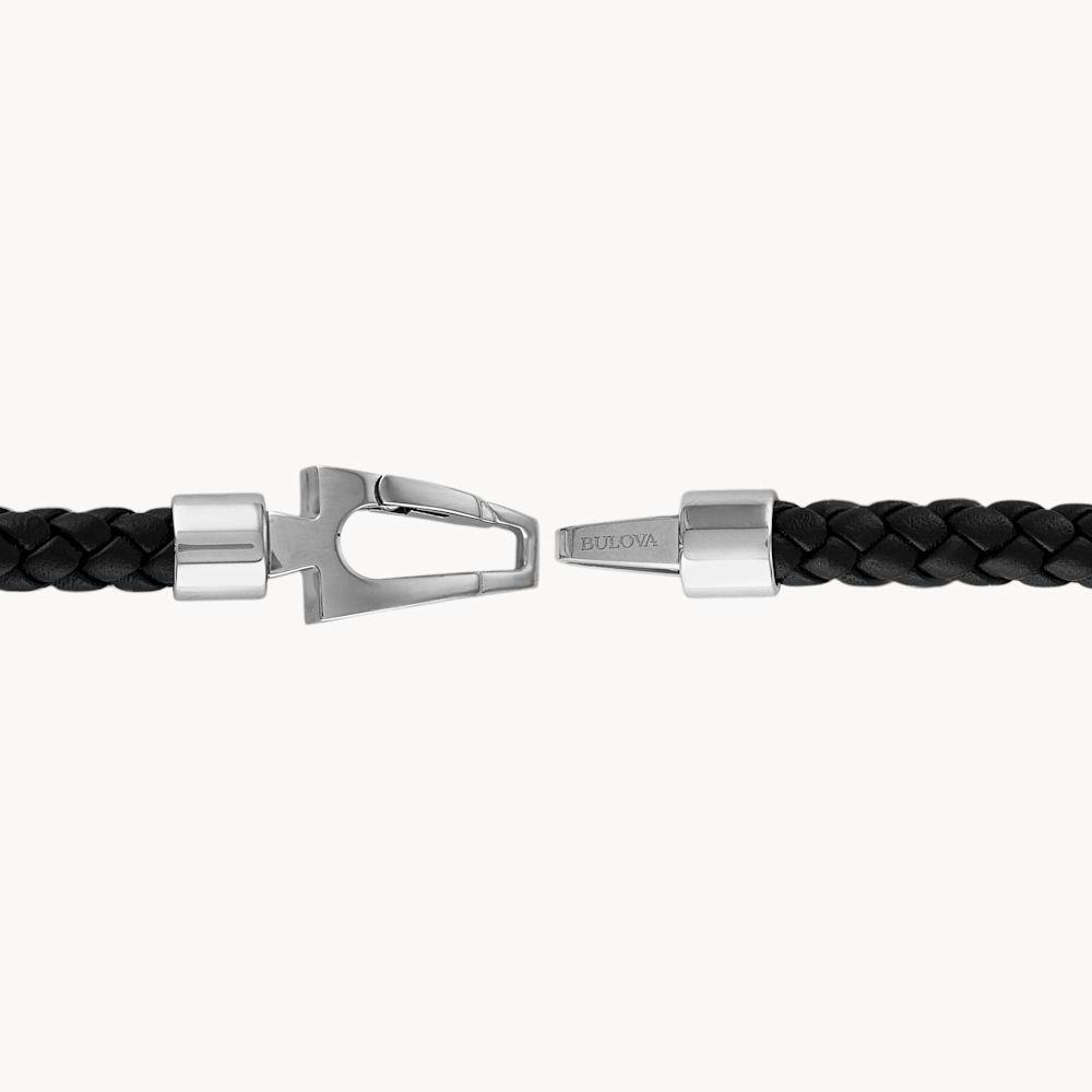 Bulova Marine Star black braided leather bracelet. Inspired by nautical ropes and color codes. Fastened by stainless-steel tuning fork clasp. Medium size