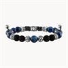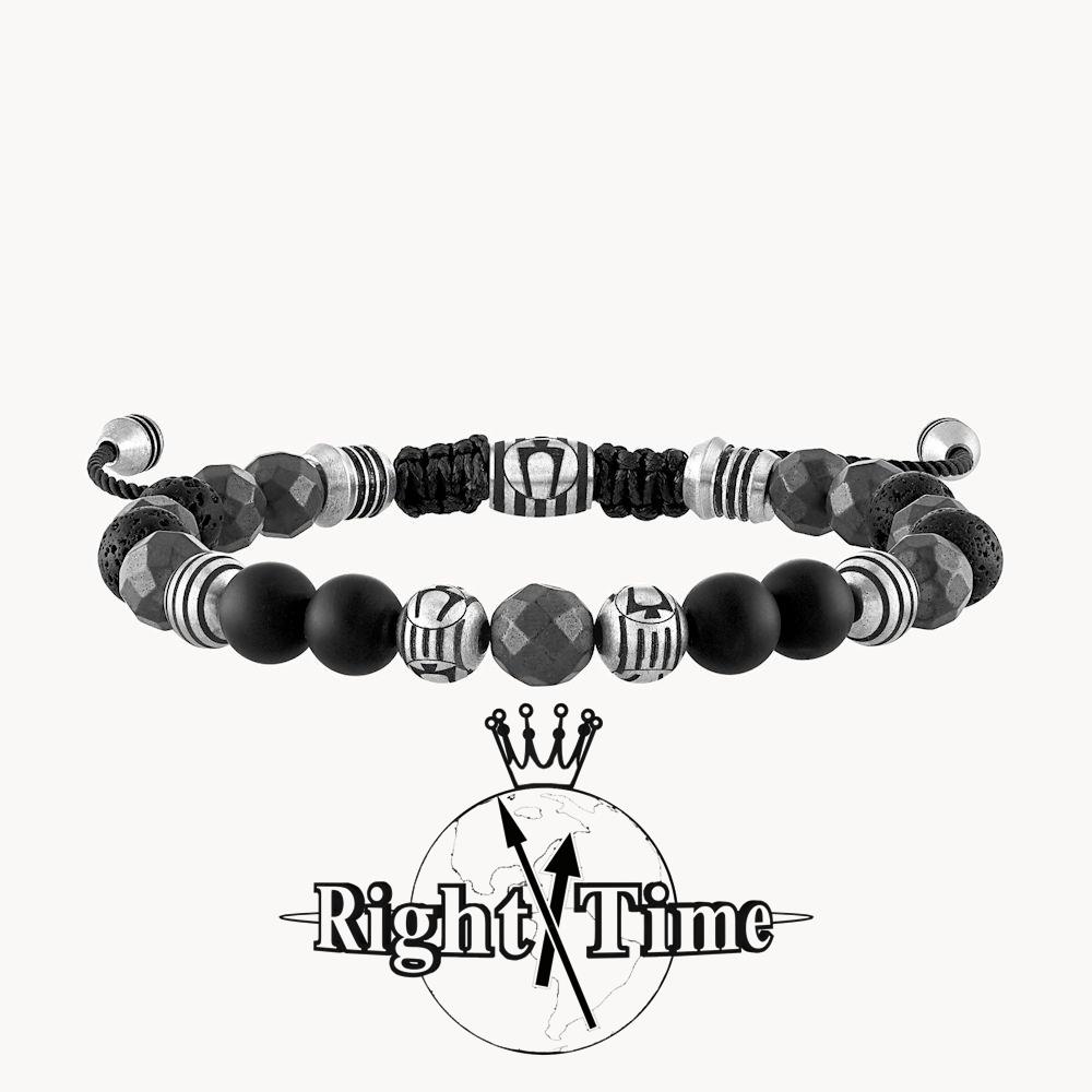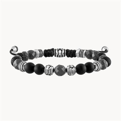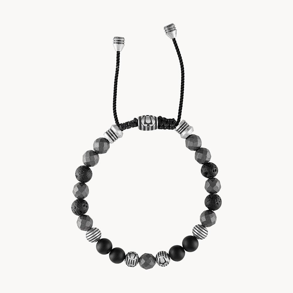 Bulova an adjustable monochromatic beaded bolo bracelet with a more rugged look features semi-precious matte black onyx, a stone of protection and stamina. Includes faceted matte hematite spheres (thought to promote stability and optimism) and black lava beads, reputed to impart calmness and strength. Accented with striped stainless steel beads featuring the Bulova tuning fork logo. Black cord with an etched logo sliding clasp adjusts easily for a comfortable fit. 8MM beads