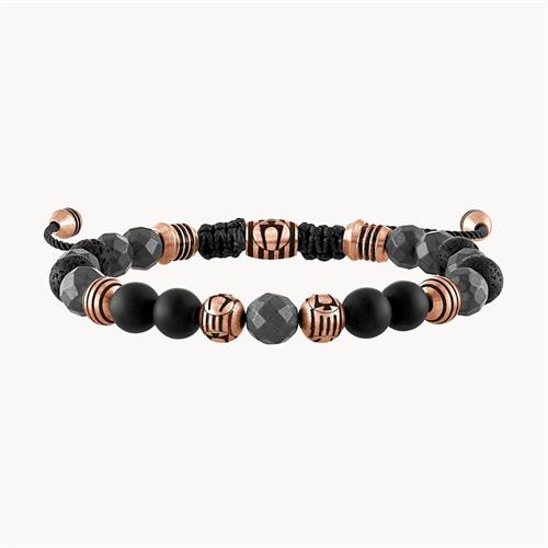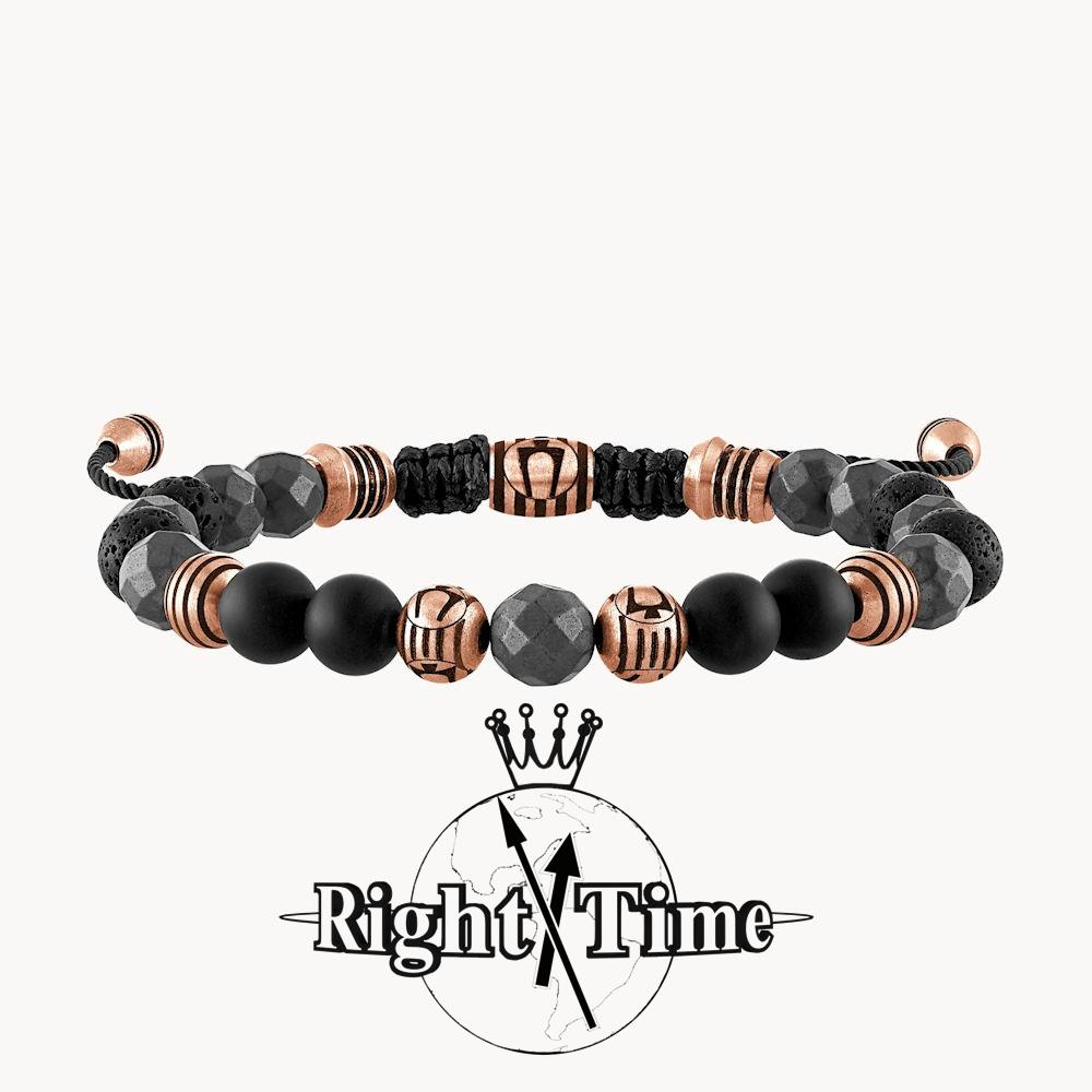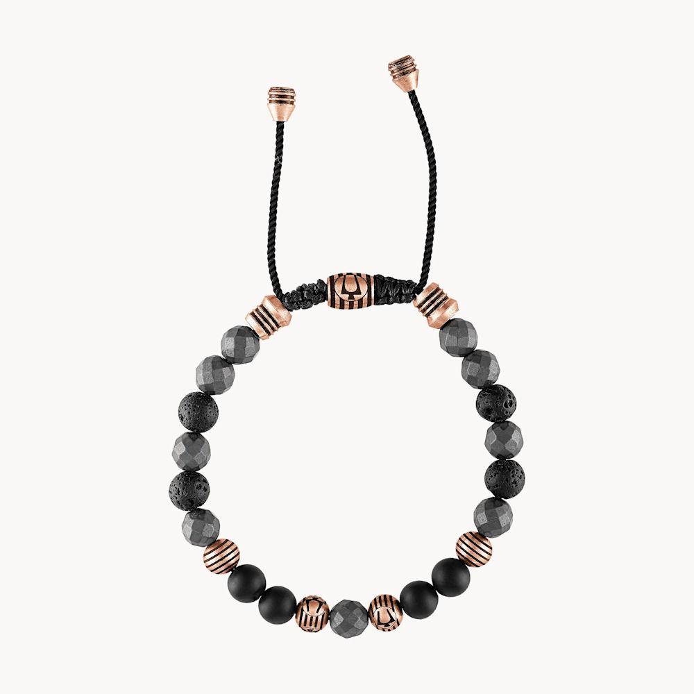 Bulova an adjustable beaded bolo bracelet with a more rugged look features semi-precious matte black onyx, a stone of protection and stamina. Interspersed with faceted matte hematite spheres, thought to promote stability and optimism, and also with black lava beads, reputed to impart calmness and strength. Accented with striped rose-tone stainless steel beads featuring the Bulova tuning fork logo. Black cord adjusts easily for a comfortable fit and is capped with two steel beads etched with the Latin GRAMMY logo. 8MM beads.