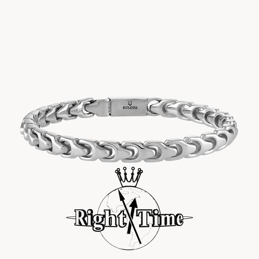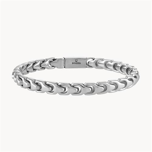 Bulova Link Collection. Destined to become a classic, this sleek and stylish 8MM stainless steel bracelet makes a bold statement. Measures 8" in length and features a box lock clasp etched with Bulova`s iconic logo.