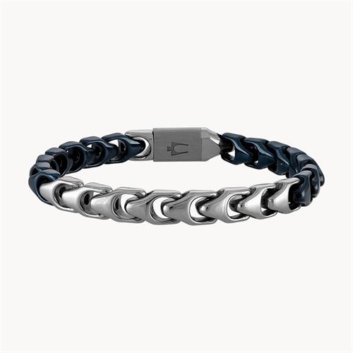 The Bulova Link Collection gets trendy in two tones! Capturing the essence of our tuning fork logo, this 8MM polished stainless steel bracelet makes a winning statement in a combination of navy blue and steel. A fabulous layering piece or perfect on its own. Measures 8.5" in length with a magnetic closure etched with Bulova`s signature tuning fork logo.