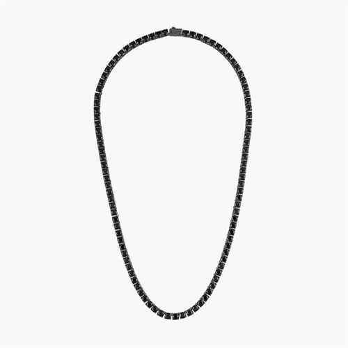 The perfect piece for a powerful, bold look. This 22" tennis necklace is made of black ruthenium-plated sterling silver in a continuous design of extraordinary 5MM black spinel, a rare gemstone believed to repel negativity while providing inspiration and empowerment. Box lock clasp is etched with Bulova signature tuning fork logo on both sides. Ruthenium plating helps enhance durability and preserve the shine on this jewelry