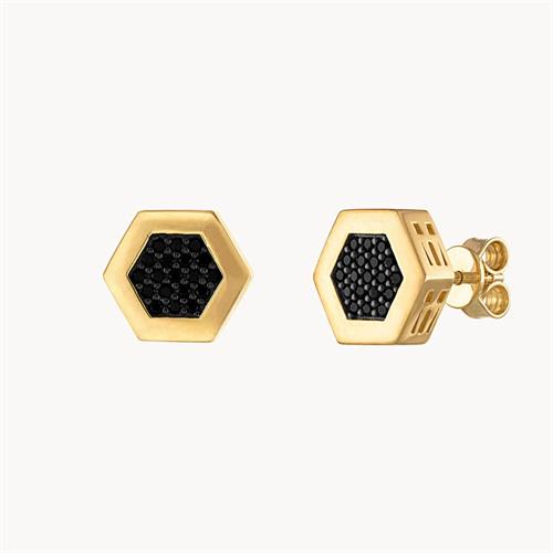Stud earrings designed in the shape of a hexagon, the symbol for harmony, structure and balance. Made of 14K yellow gold-plated sterling silver inlaid with black diamonds totaling 0.38 CTTW and cutout designs on all six sides, they secure comfortably with friction backs. Measures 10MM in diameter