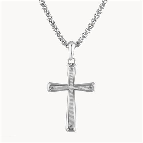Cross pendant made of sterling silver features an inlay of eye-catching Damascus steel, a combination of multiple steels layered and forged together several times to reveal rings and lines of varying steel-like colors. Rounded box link chain necklace in sterling silver adjusts from 24" to 26" with extender ring and pear-shaped lobster clasp. Pendant measures 32MM L x 22MM W. All of our sterling silver is rhodium plated to give the jewelry a brilliant shine and provide enhanced durability