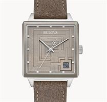 Bulova Frank Lloyd Wright Kalil House Automatic watch model 98A330. Tribute to the Toufic H. Kalil house, one of the prolific architect`s Usonian Automatic homes, built in 1955. Textured gray and green dial evokes the home and its forested surroundings while recreating its most eye-catching element, the modular block construction and multiple rows of rectangular windows. Automatic movement. Grey ion-plated stainless steel case with brown leather strap.