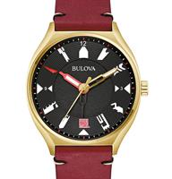 Bulova Frank Lloyd Wright Automatic Men`s Watch model 97A192. Celebrates the iconic architect`s Usonian homes. Citizen Quartz analog movement. Black multi-layer dial with cutout markers inspired by the perforated clerestory panels in Usonian homes. Gold tone stainless steel case on a red burgundy leather strap.