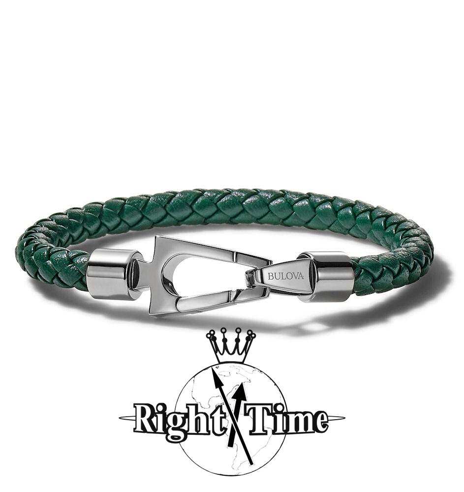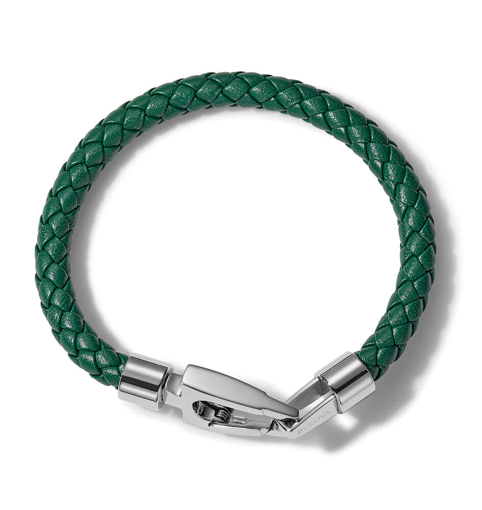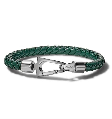 Bulova Marine Star green braided leather bracelet. Inspired by nautical ropes and color codes. Fastened by stainless-steel tuning fork clasp. Medium size