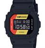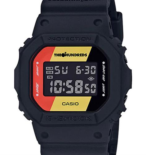 G-Shock DW5600 Series by Casio. Produced in collaboration with THE HUNDREDS, the Los Angeles lifestyle brand that celebrates its 15th anniversary this year. Black finish case and band. Black/red/yellow digital LCD dial. 200 meters water resistant.
