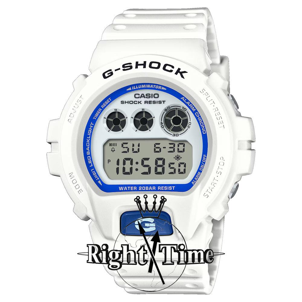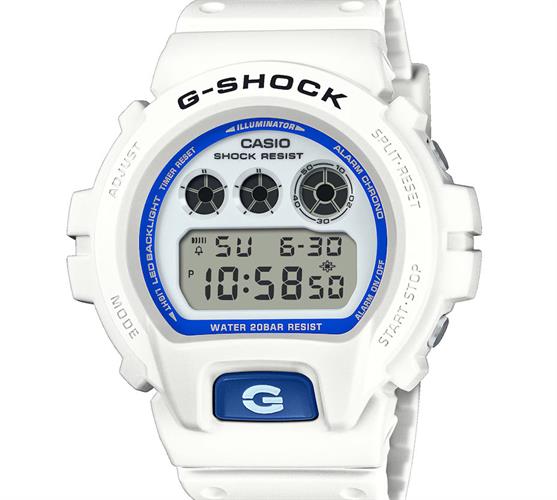 Casio G-Shock 6900 series model DW6900HDS-7. Quartz digital movement. White color resin case and band. Luminous dial with white digital display and blue outlines. Functions include stopwatch, timer, alarm, and backlight.