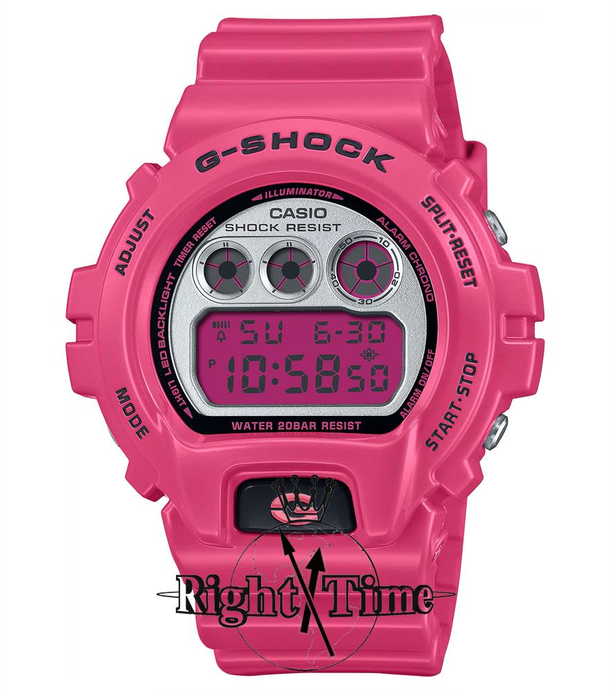 Casio G-Shock 6900 series model DW6900RCS-4. Quartz digital movement. Polished pink color resin case and band. Silver dial with pink digital display. Functions include stopwatch, timer, alarm, and backlight.
