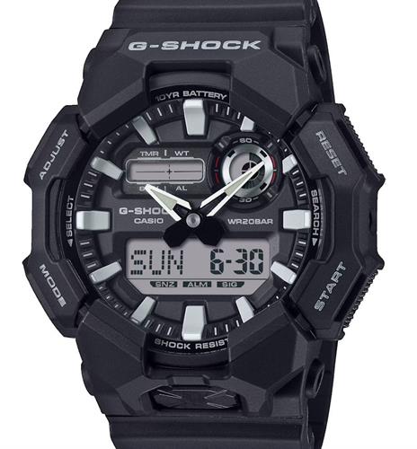 G-Shock GA-010-1A by Casio. Black case with Ana-Digital display. World time and stopwatch. High-brightness LED light. 200 meters water resistant.
