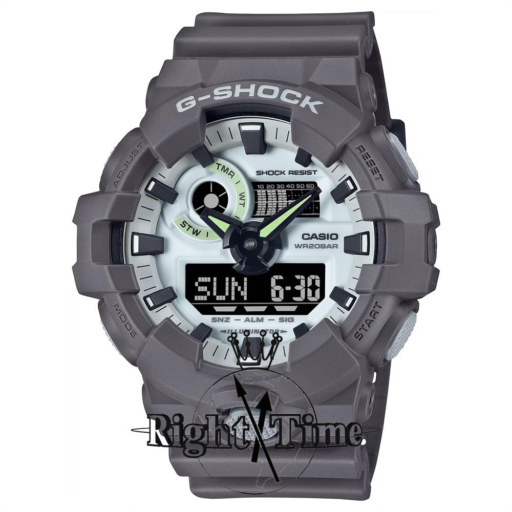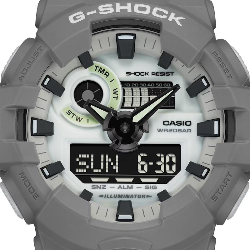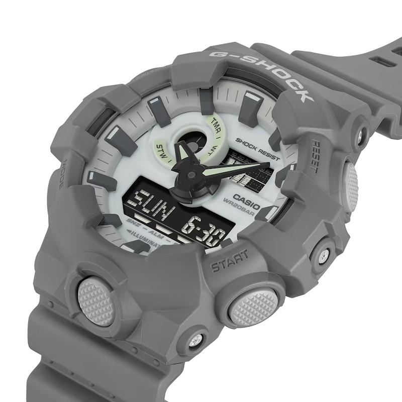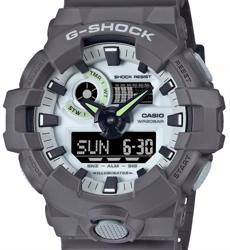 Casio G-Shock 700 series model GA-700HD-8A. Grey color high-strength resin case and band. Luminous dial with black color digital display. Shock Resistant. Front button super illuminator light. 200 meters water resistant. Functions include stopwatch, alarms, timer, and World time.