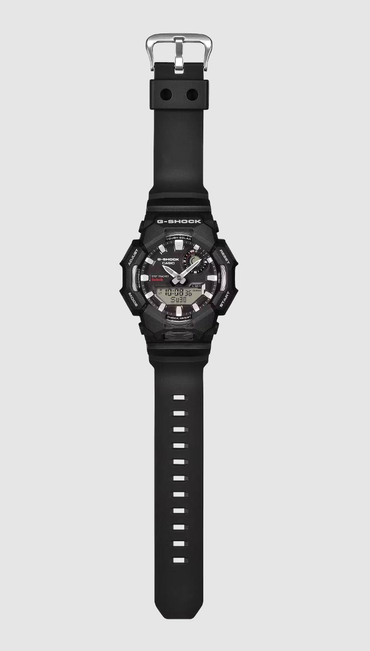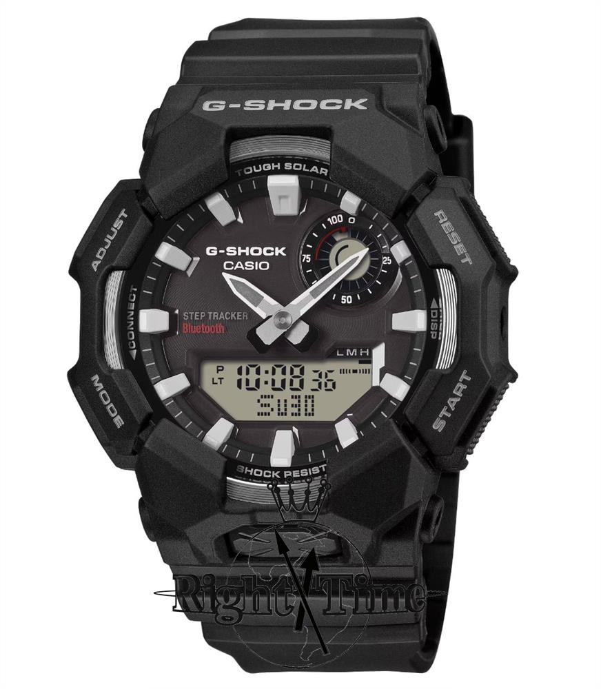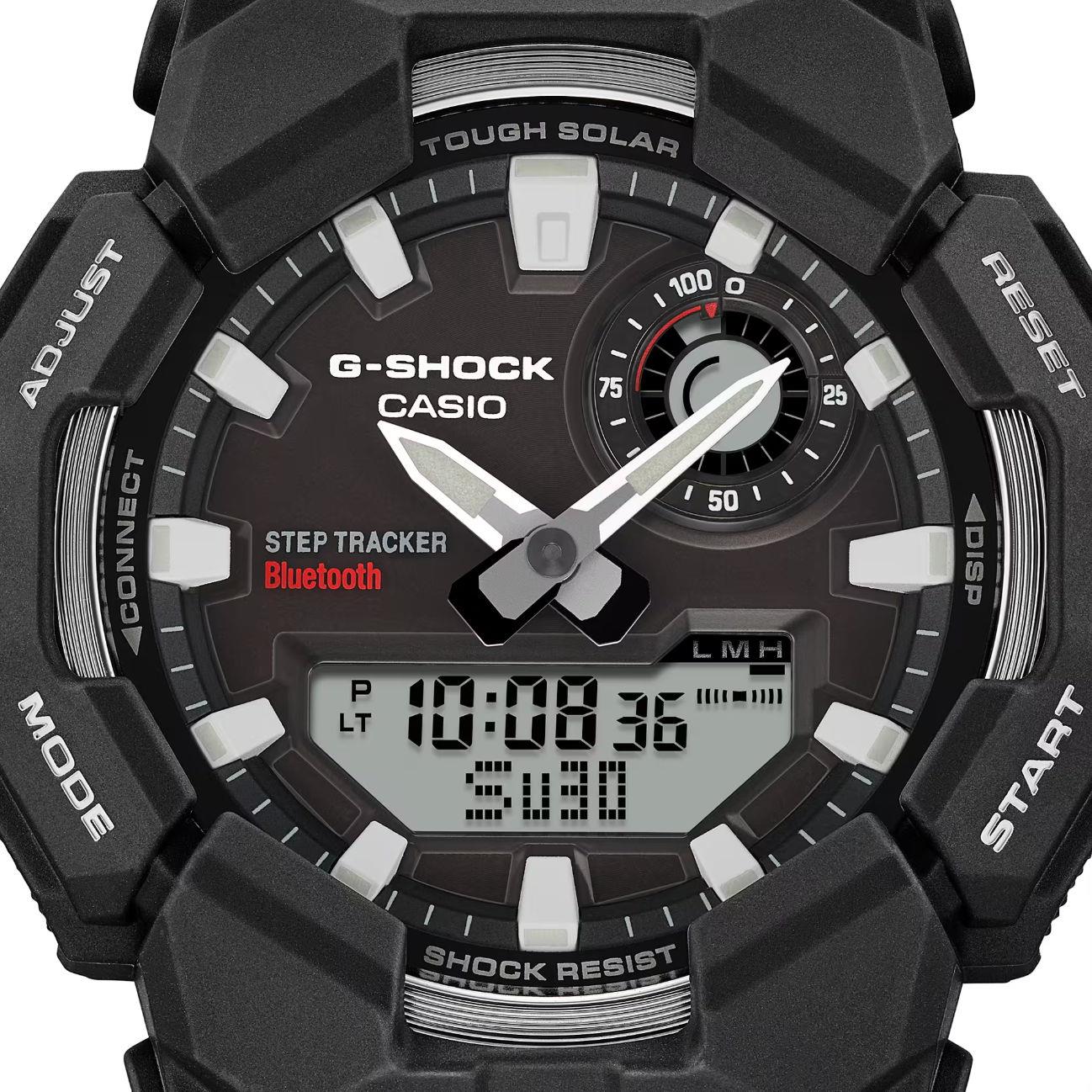 G-Shock GA-010-1A by Casio. Black case with Ana-Digital display. Solar powered. Count steps and display tracked data on the digital display. The watch also sends data to a paired smartphone via Bluetooth. Simply tap into the CASIO WATCHES app for automatic precision timekeeping and to easily manage life logs from your phone. The watch features also includes: world time, stopwatch and high-brightness LED light. 200 meters water resistant.