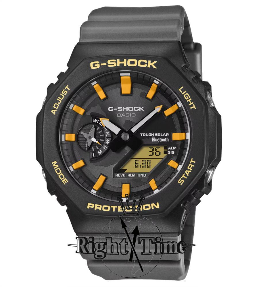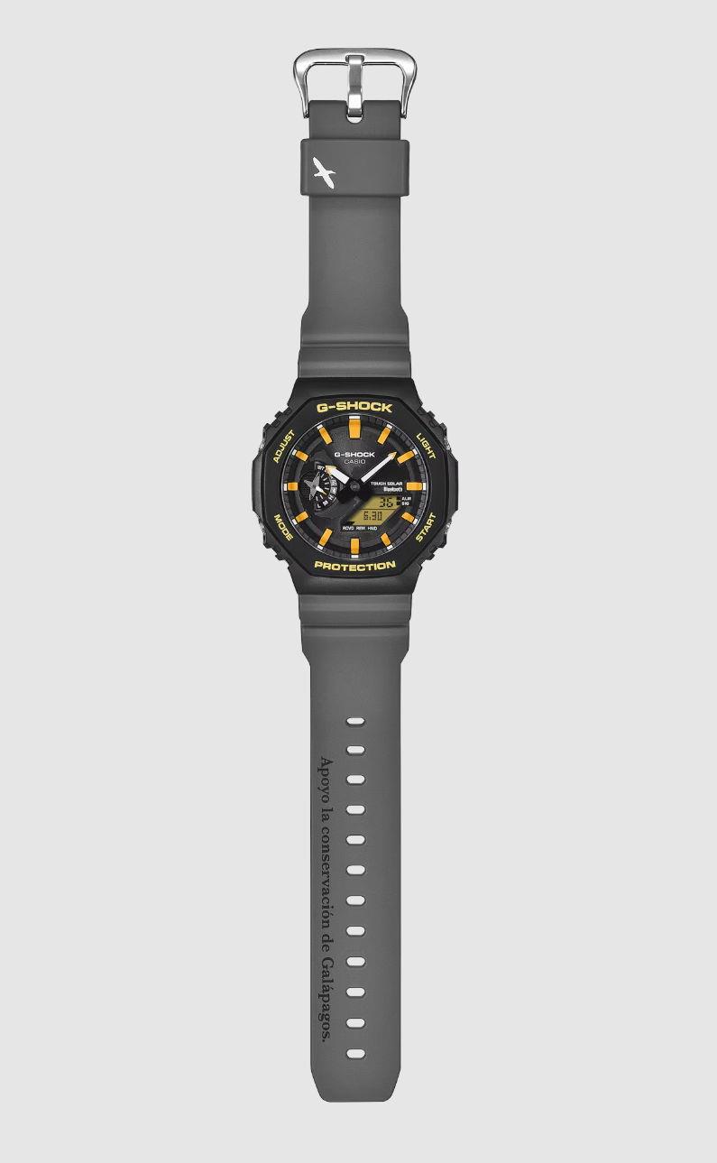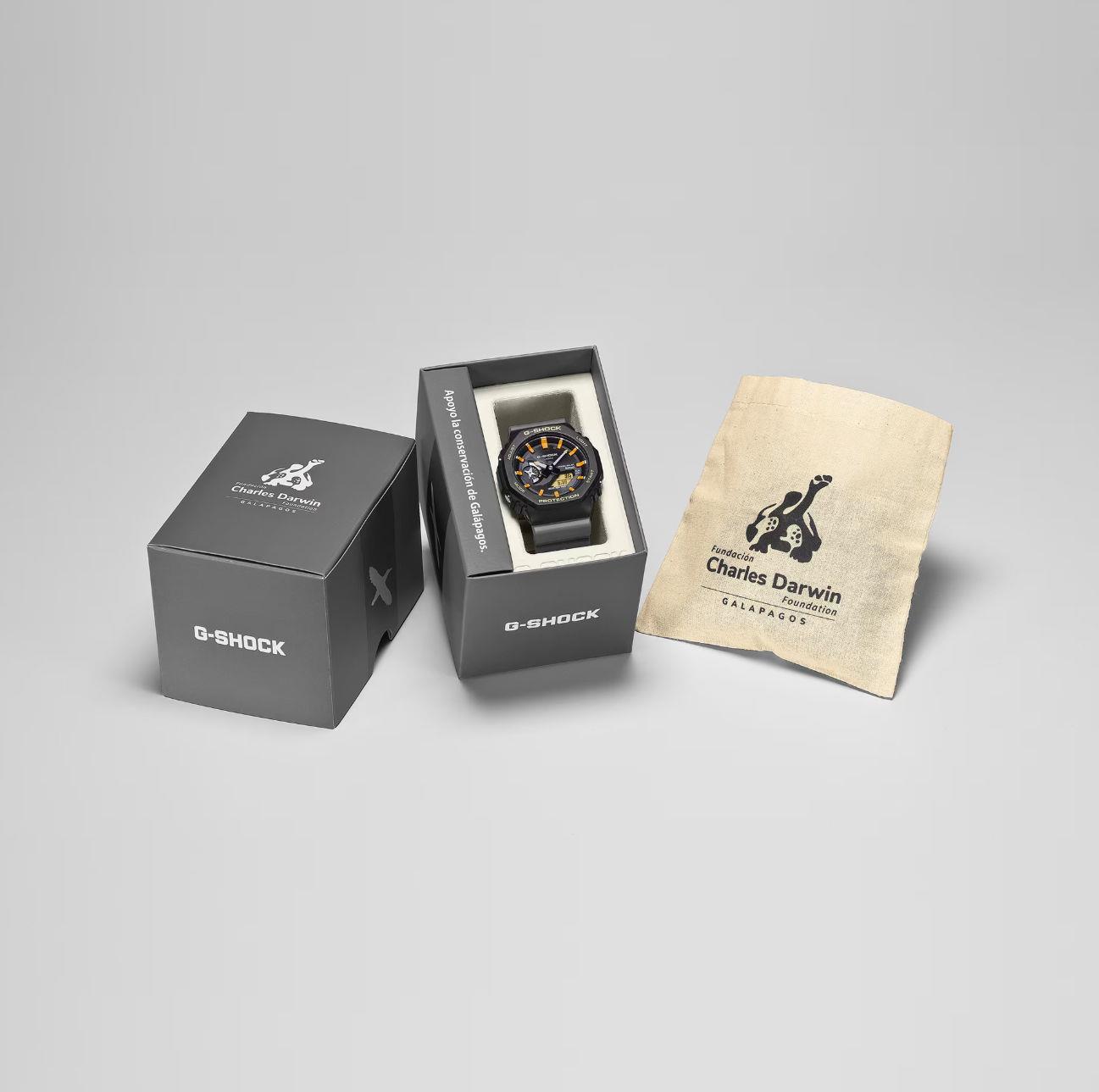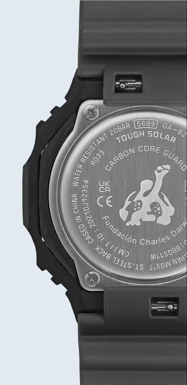Casio G-Shock Charles Darwin Foundation collaboration models GA-B2100DF-1A. Inspired by the Galapagos Albatross, one of the largest birds on the islands. Solar powered with Bluetooth smart-link capability. Black resin case and band. Black analog/digital dial. Features include stopwatch, count-down timer, world time, and a built-in LED. Water resistant to 200 meters.