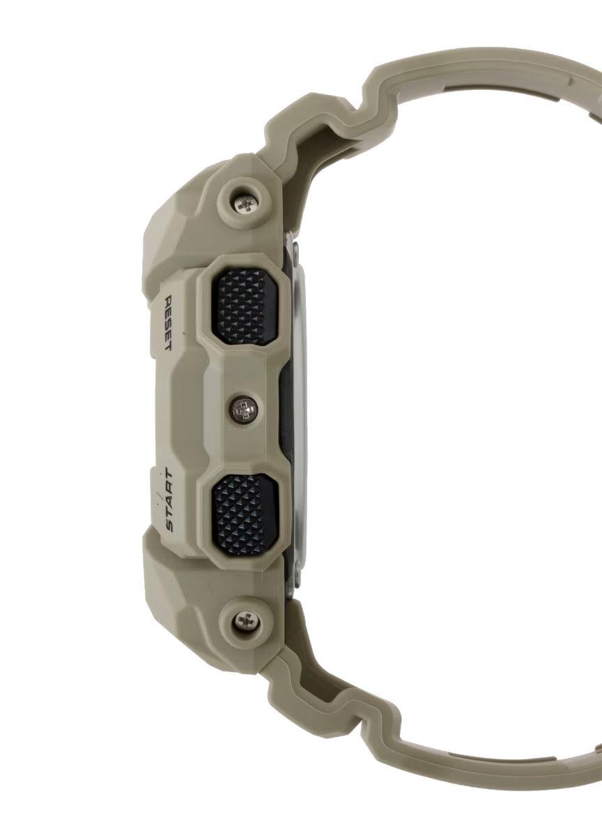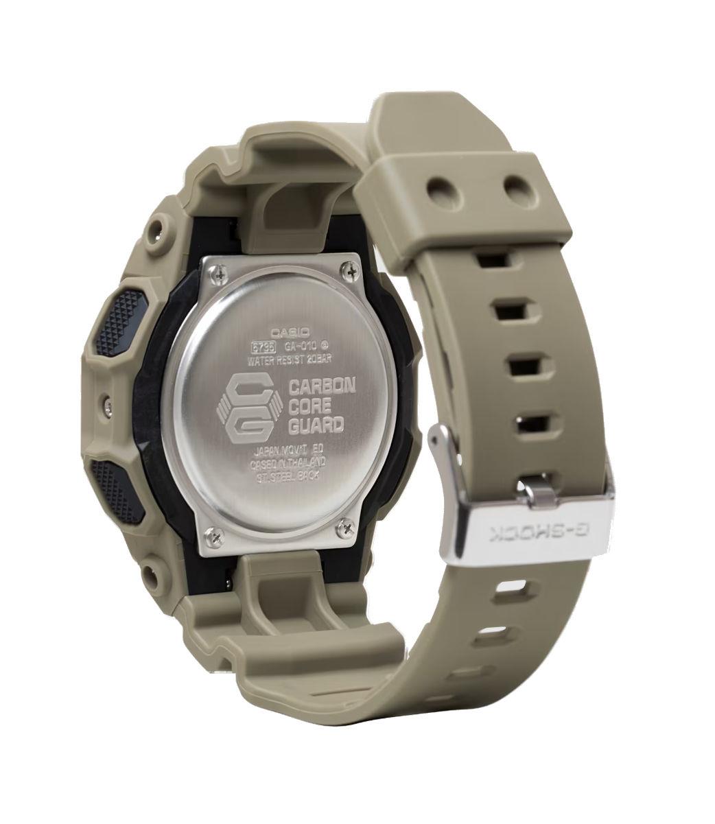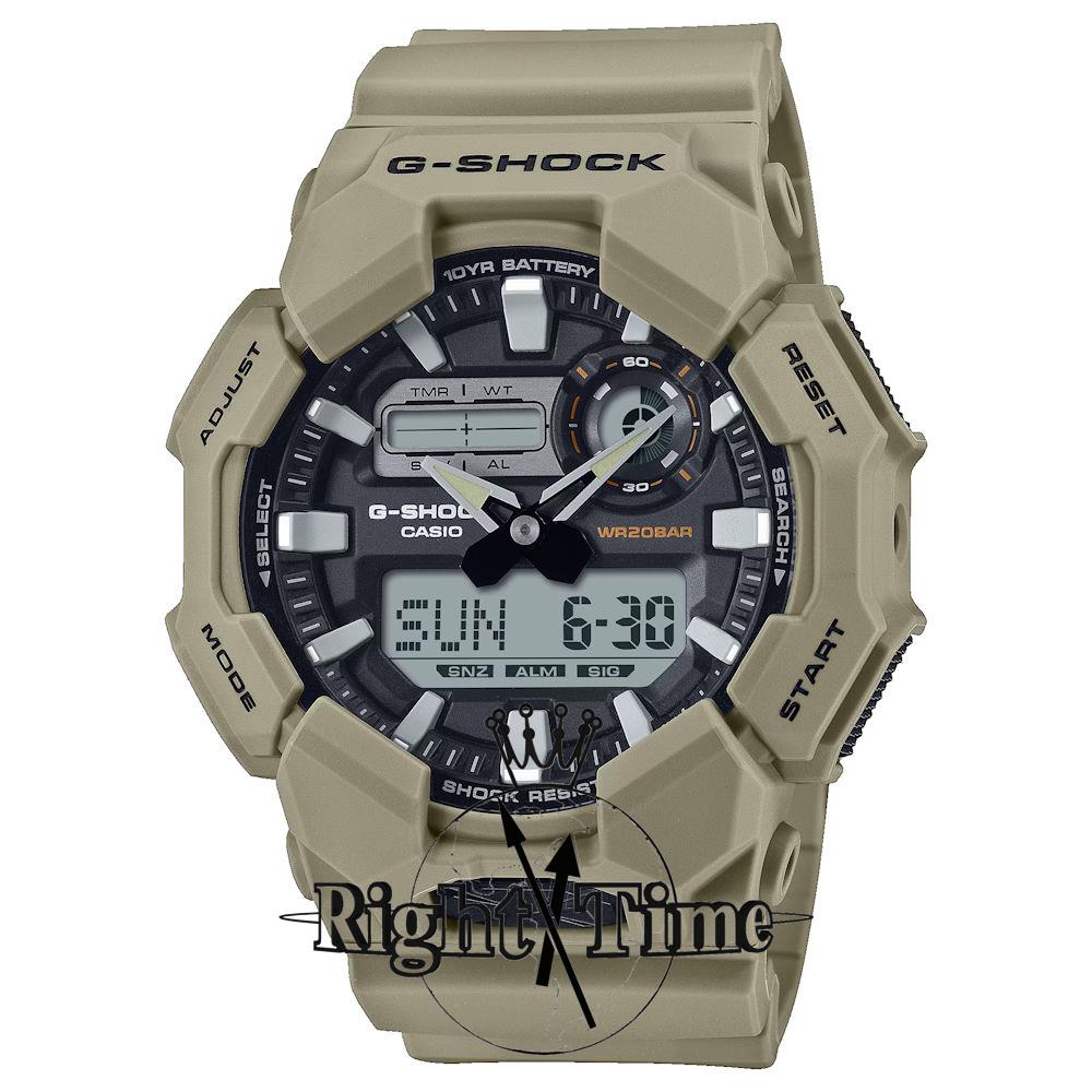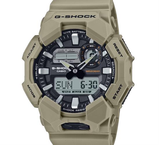 G-Shock GA010-5A by Casio. Khaki color case with Ana-Digital display. World time and stopwatch. High-brightness LED light. 200 meters water resistant.