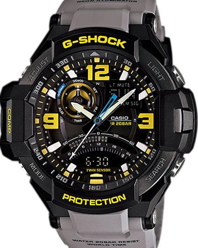 G-Shock G-Aviation GA1000 Series. Equipped with Twin Sensor capabilities. Digital Compass Mode with bearing memory, temperature measurement, easy reading in the dark. Orange resin composite band, ana-digi black display.