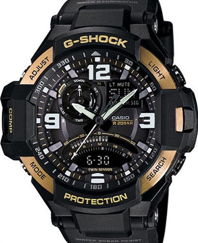 G-Shock G-Aviation GA1000 Series. Equipped with Twin Sensor capabilities. Digital Compass Mode with bearing memory, temperature measurement, easy reading in the dark. Black resin composite band, ana-digi black display, black case, gold tone bezel.