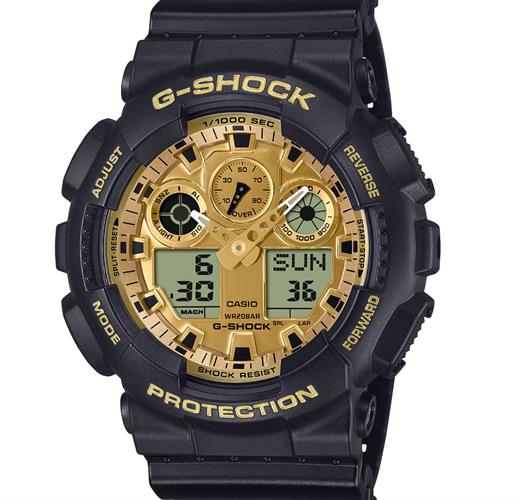 G-Shock GA100GGB-1A9 by Casio. X-large black case and band. Gold tone dial with Ana-Digital 3-D look, "three-eyed monster" dial. 200 meters water resistant.