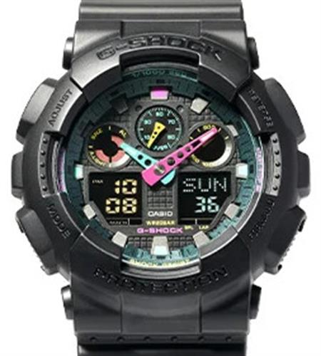 Casio G-Shock Multi-Fluorescent model GA100MF-1A. Multi-colored hands and dial. Black resin case and band. Analog/digital display. Functions include time/date, stopwatch, timer, World time, and alarm. Water resistant to 200 meters.