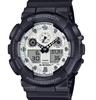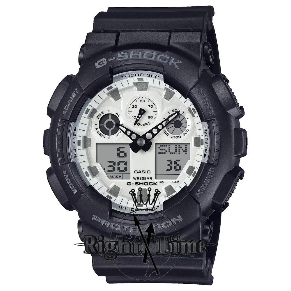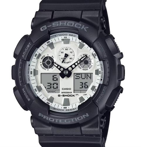 G-Shock GA100WD-1A by Casio. X-large black case and band. White dial with Ana-Digital 3-D look , "three-eyed monster" dial. 200 meters water resistant.