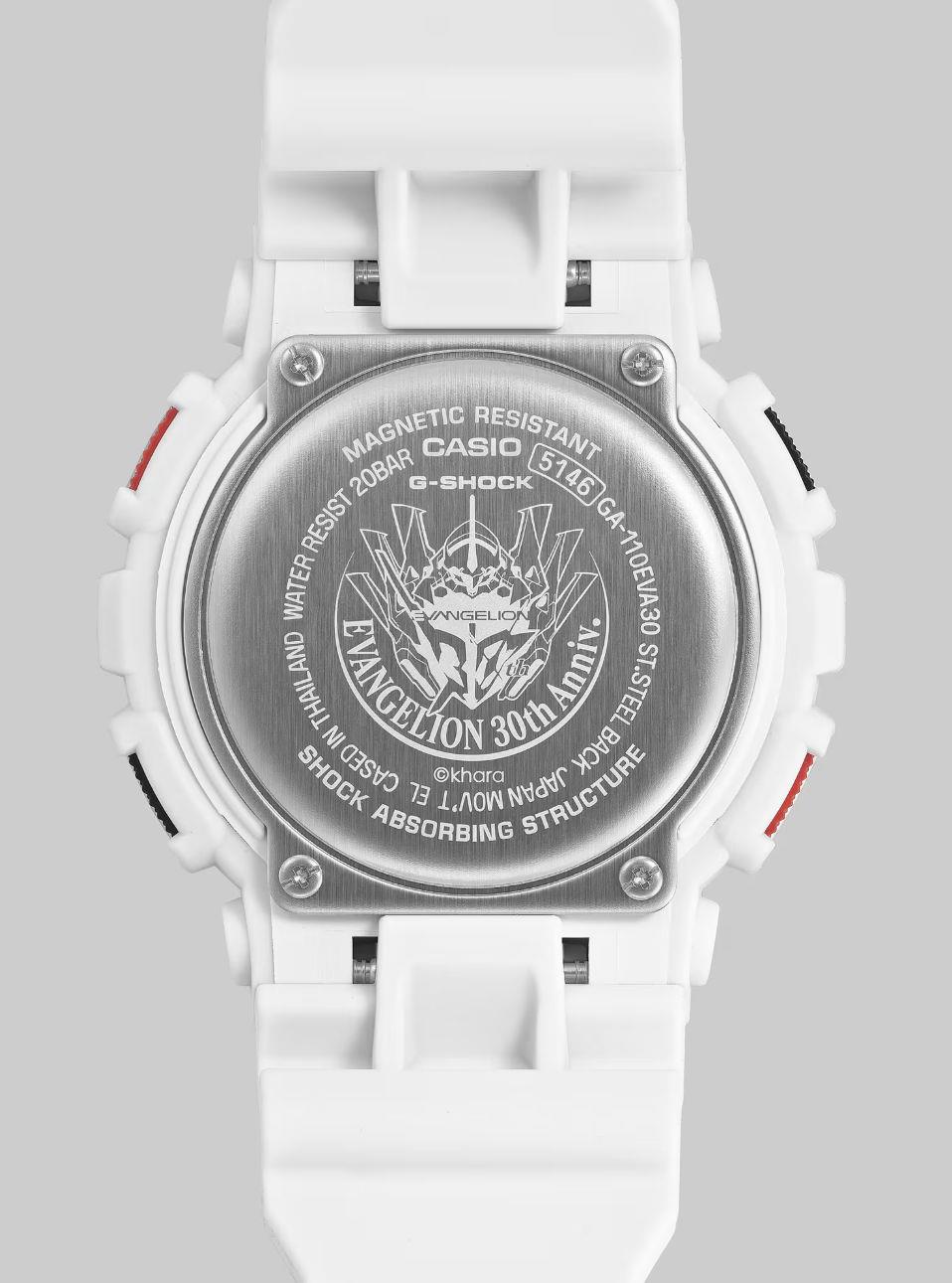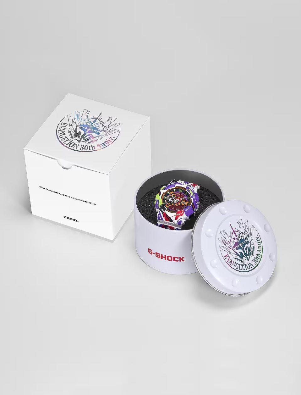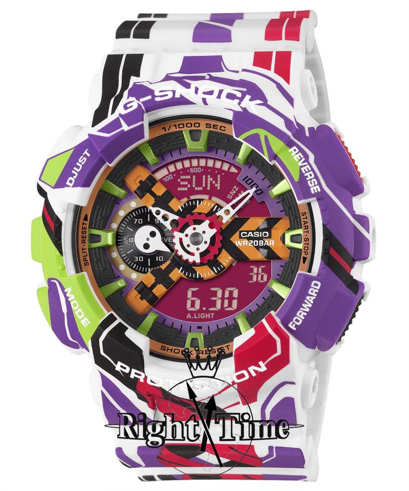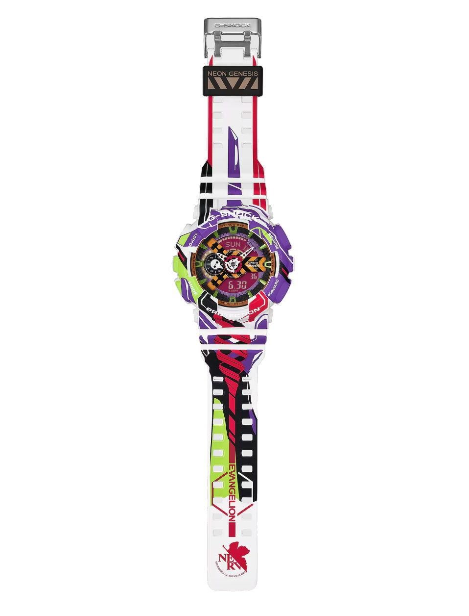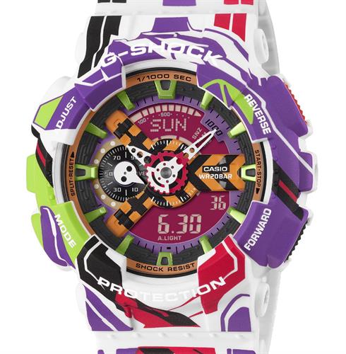 G-Shock EVANGELION Collaboration Model GA110EVA307A by Casio. G-SHOCK teams up with EVANGELION, the iconic anime series with a passionate global following, to mark the 30th anniversary of the original TV broadcast. This special edition was designed by Ikuto Yamashita, the mechanical designer behind the EVANGELION series. For this special collaboration, Yamashita created original artwork that captures the intensity of the series` immersive world.
