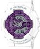 Casio G-Shock 2023 Winter Collection model GA110WS-7A. Casio quartz analog/digital module. White resin case and band. Metallic purple dial with steel tone hands. Mineral glass crystal. Functions include day/date, World time, stopwatch, timer, and alarms. Water resistant to 200 meters.